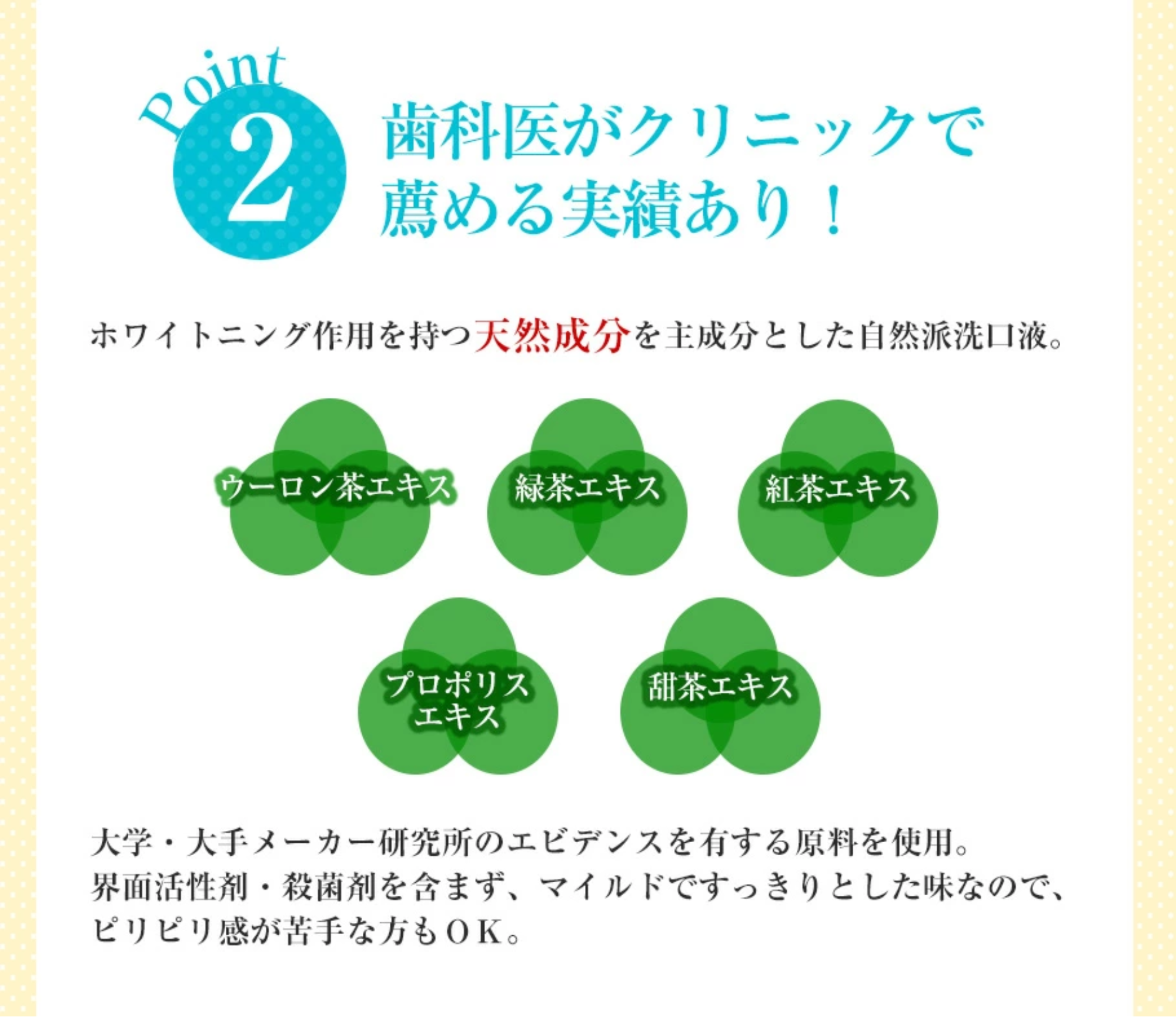 虫歯予防 | ・ウーロン茶エキス (サントリー研究所のエビデンス) ・緑茶エキス (東京医科歯科大学のエビデンス) ・テアビゴ(EGCG):緑茶由来 (日本大学歯学部のエビデンス) |
