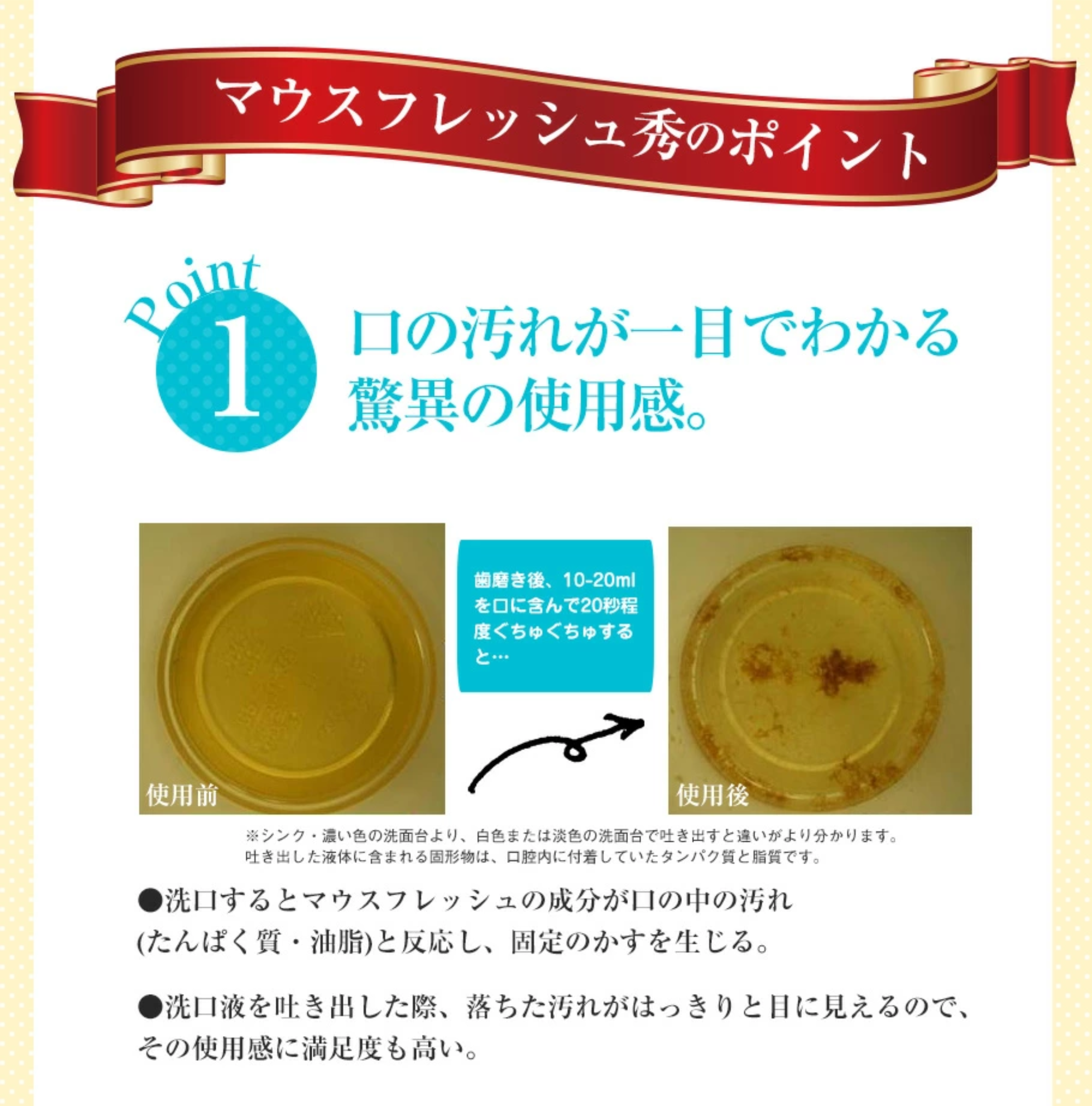 ご使用方法: | 適量(10~20ml)を口に含み、15~20秒すすいでから吐き出して ください。ブラッシングとの併用をお勧めします。 |