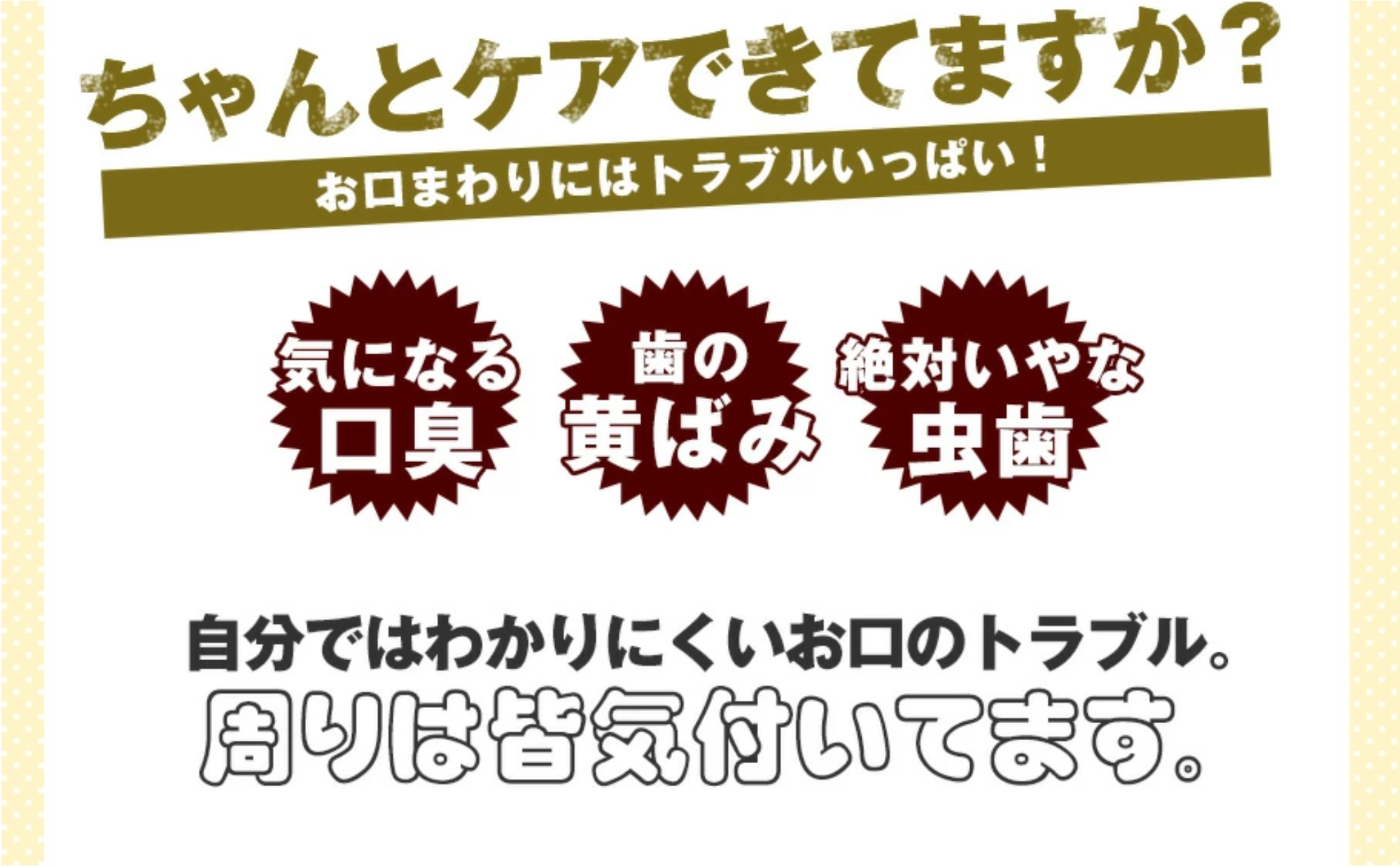 口臭予防 | ・ルブス乾燥エキス:甜茶由来 (ロッテ中央研究所のエビデンス) ・テアビゴ(EGCG) |