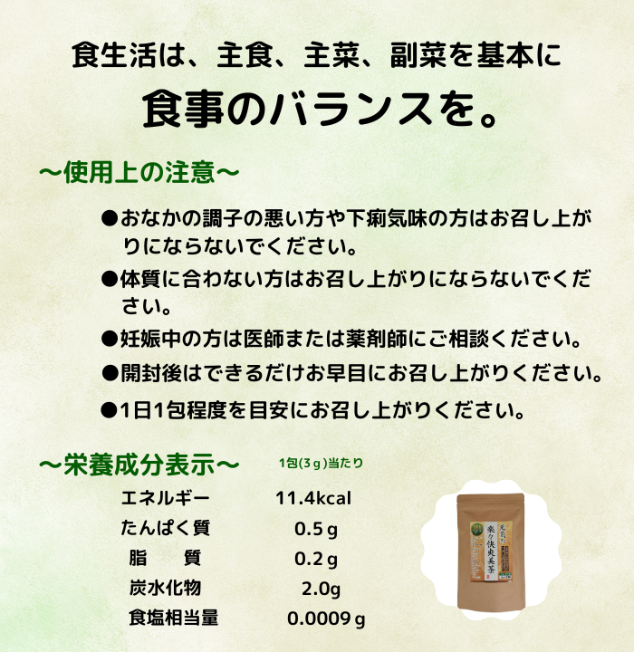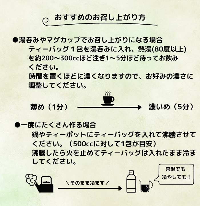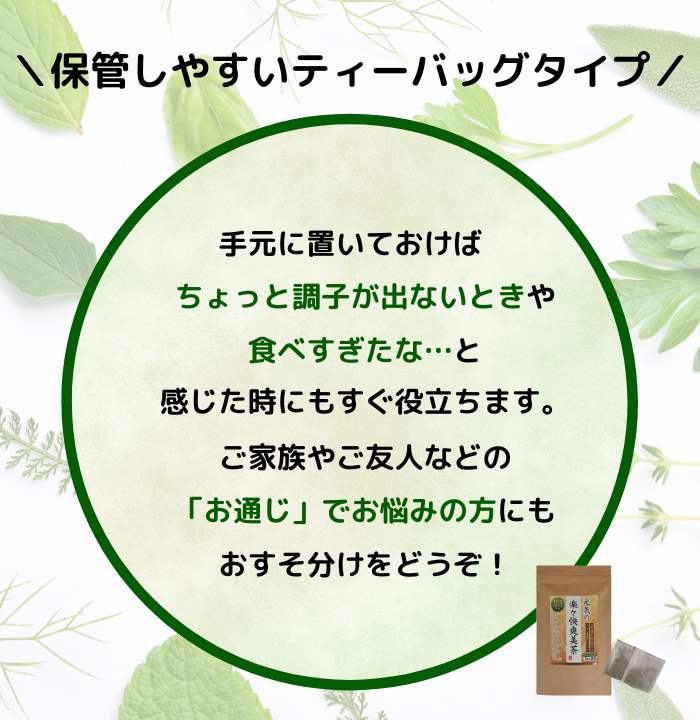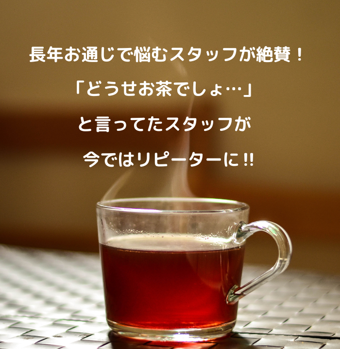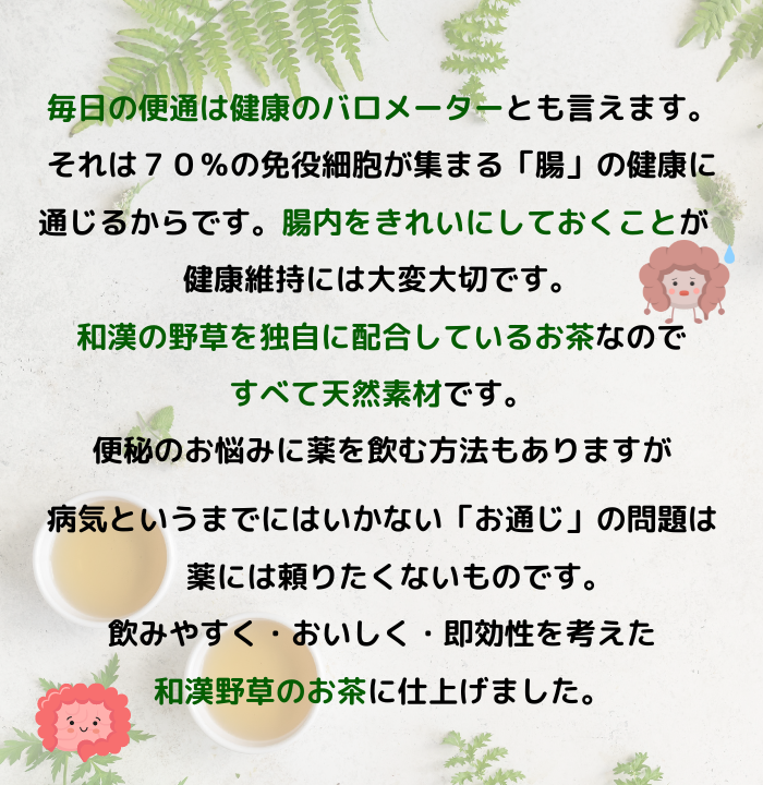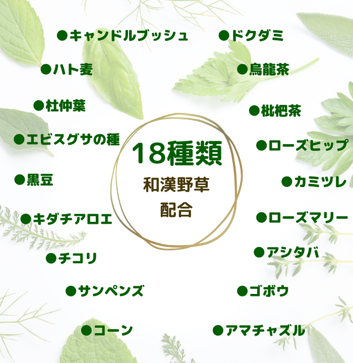 和漢の野草を独自に処方しているお茶なので、材料はすべて天然素材です。安心してお飲みいただけます。