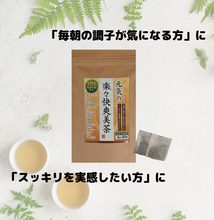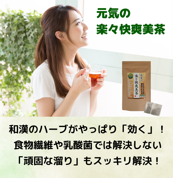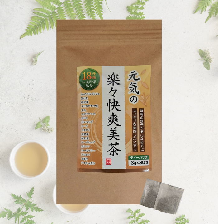 元気の楽々快爽美茶は、飲みやすく・美味しく・即効性を考えた「和漢野草」のお茶に仕上げました。